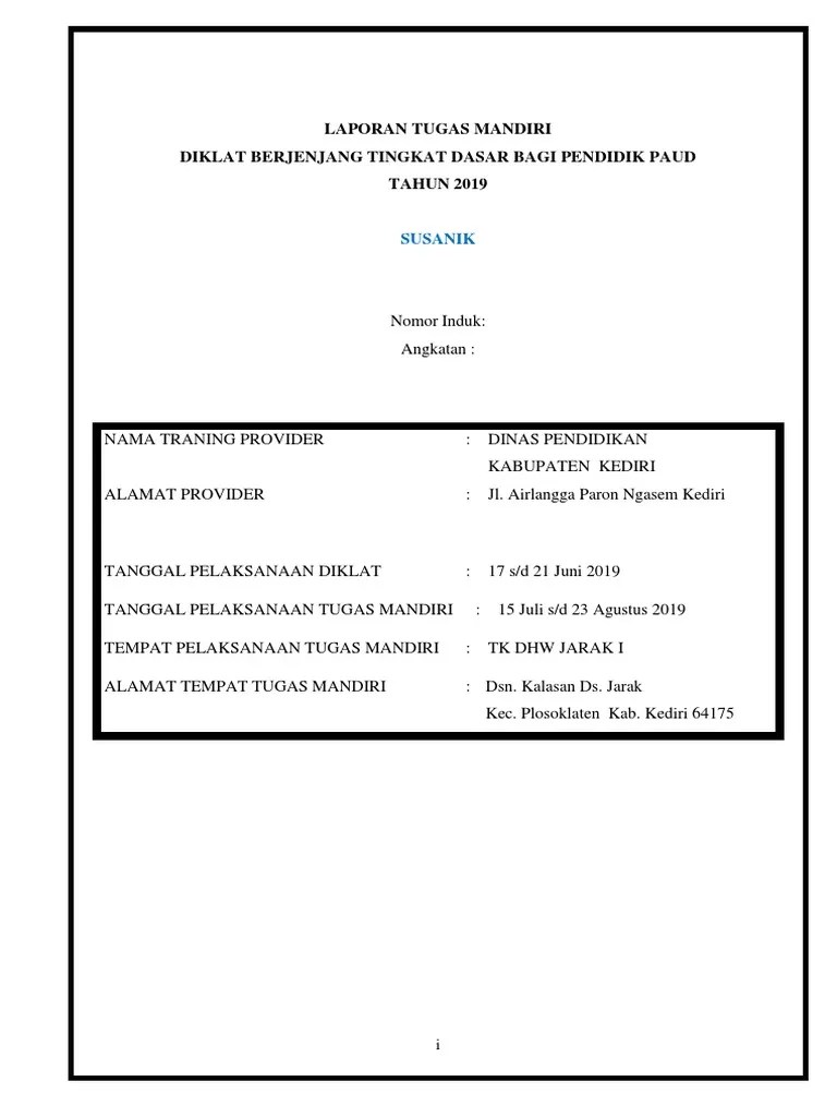 Angkatan i nama training provider Pendidik paud melaksanakan tugasnya sebagai guru di. Laporan tugas mandiri diklat berjenjang tingkat dasar bagi pendidik paud tahun 2018. Aspek yang dilaporkan peran pendidik/pengasuh dokumen pendukung (foto) pelaksanaan program makan bersama ( ragam menu, penyajian ) mengetahui pengelola/kepala . Laporan tugas mandiri diklat guru pendamping muda (diklat dasar) bagi pendidik paud tahun 2019noneng nomor induk :